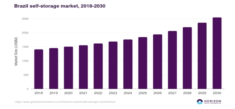 O mercado global de self storage também apontou tendências positivas. Em 2024, o Brasil faturou cerca de US$ 1,757,8 milhões no segmento, com projeção de alcançar US$ 2,542,3 milhões até 2030, o que significa crescimento médio anual (CAGR) de 6,6% segundo o Grand View Research.